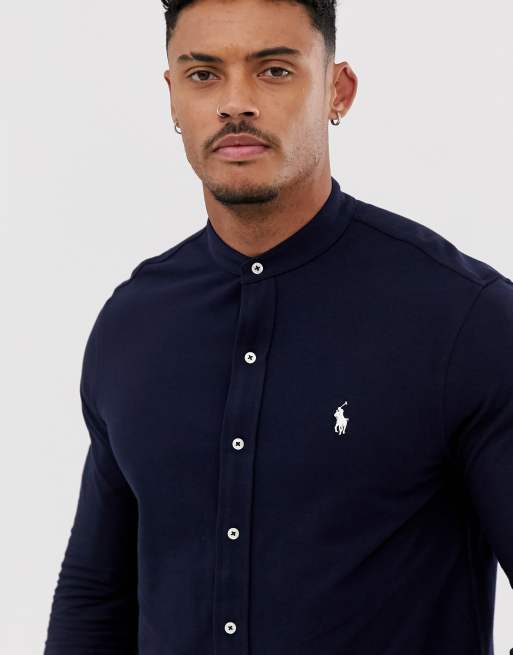 Polo Ralph Lauren player logo grandad collar pique shirt slim fit in navy Very well made.