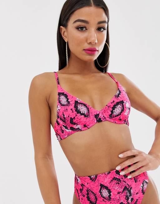ASOS DESIGN mix and match underwired bikini top in pink neon snake print Very well made.